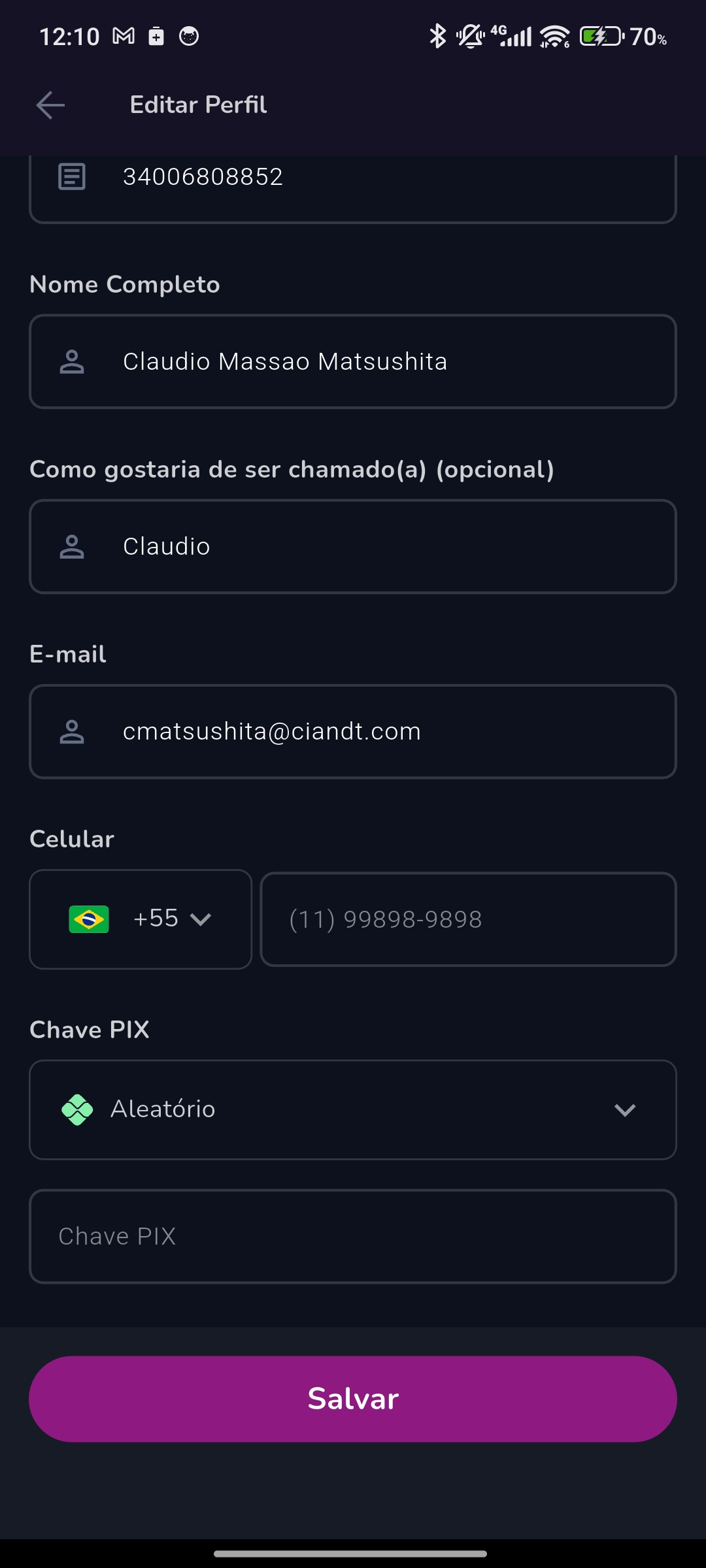 Perfil -> Editar chave pix aleatória -> Salvar -> Fechar app -> Abrir app-> Perfil -> Editar chave pix -> Campo dá chave vazio